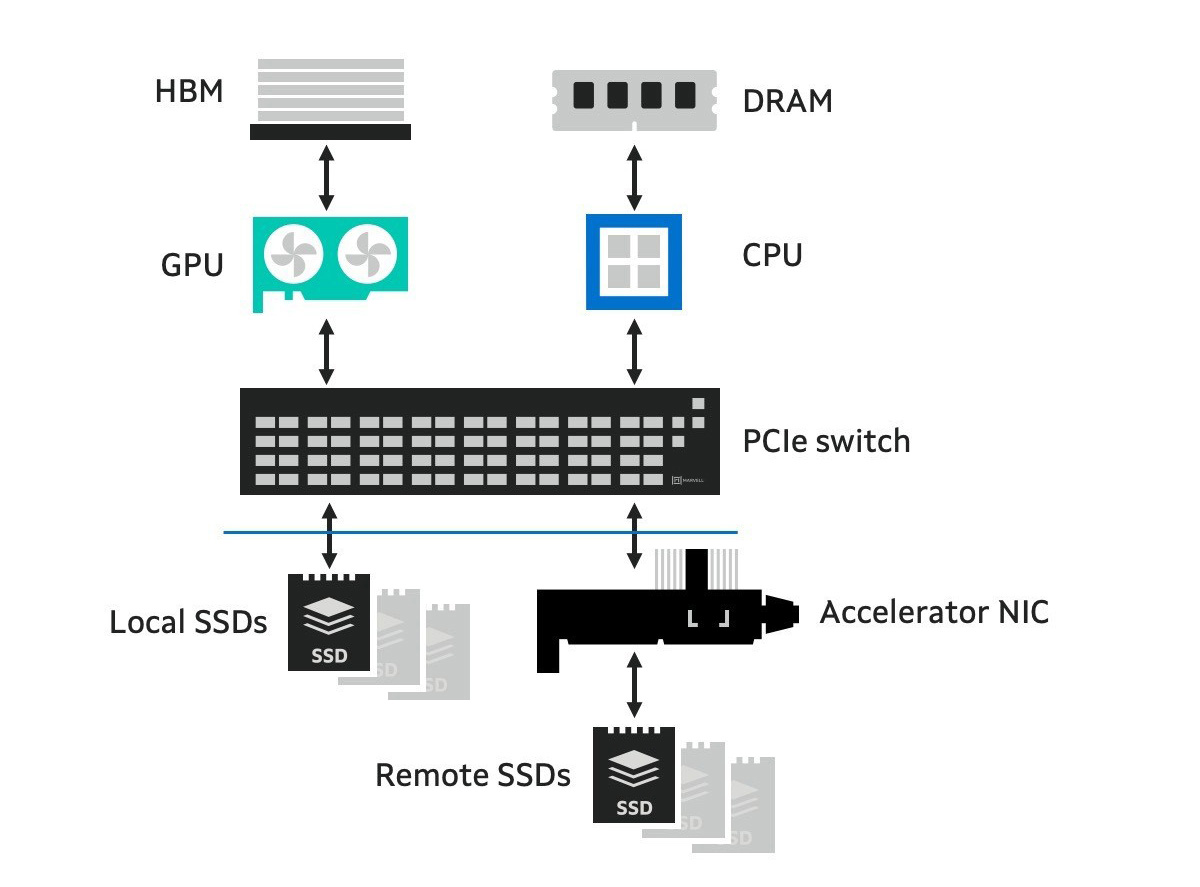 In each tray of scale-up AI environments, multiple SSDs (currently up to eight) are directly attached to GPUs (currently up to four) via PCIe bus behind a PCIe switch. The GPU initiates storage transactions within the SCADA framework which is built around memory semantics.